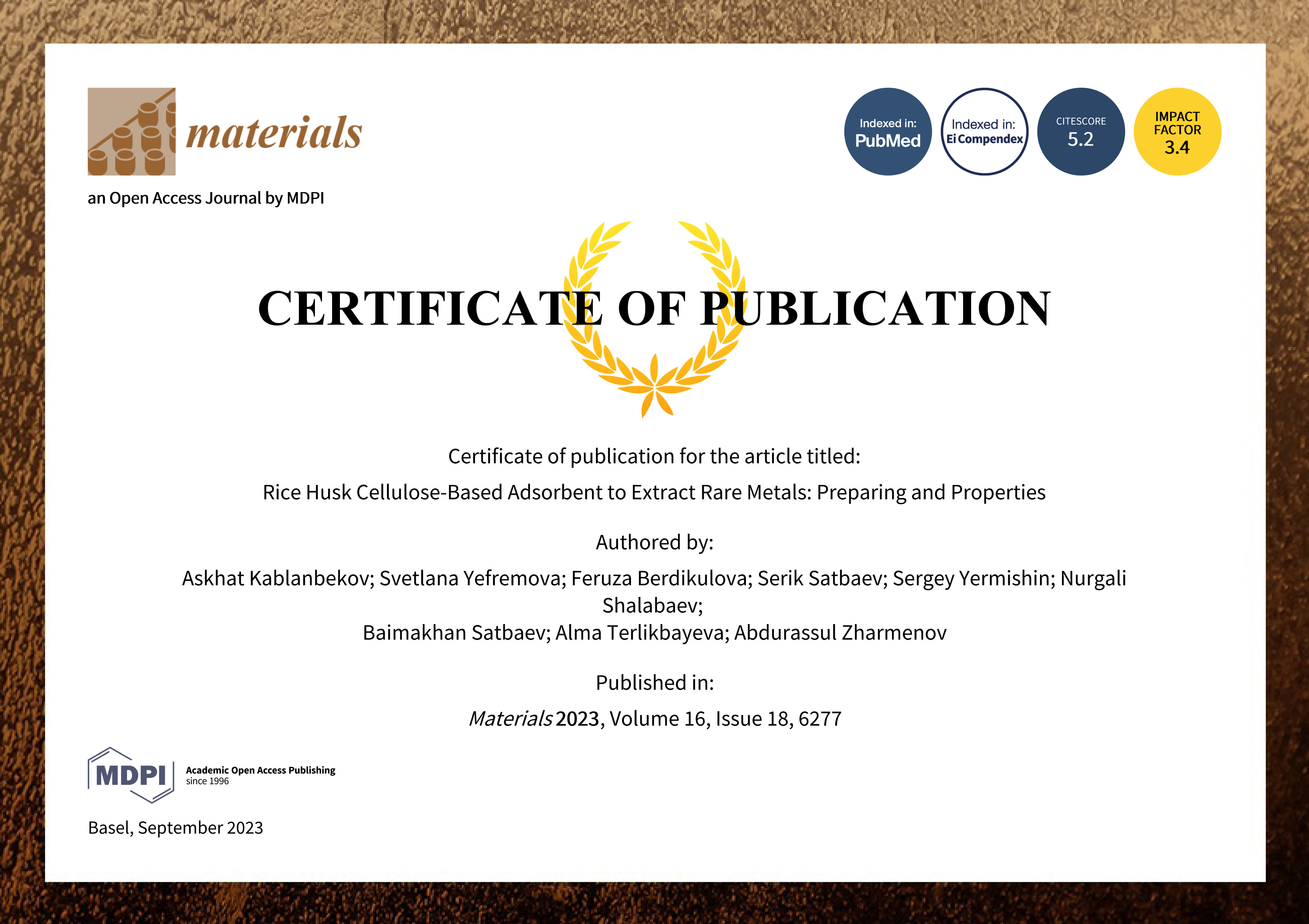 - A. Kablanbekov, S. Yefremova, F. Berdikulova, S. Satbaev, S. Yermishin, N. Shalabaev, B. Satbaev, A. Terlikbayeva, A. Zharmenov. Rice Husk Cellulose-Based Adsorbent to Extract Rare Metals: Preparing and Properties / Materials. – 2023. – 16(18). – 6277. DOI: 10.3390/ma16186277.