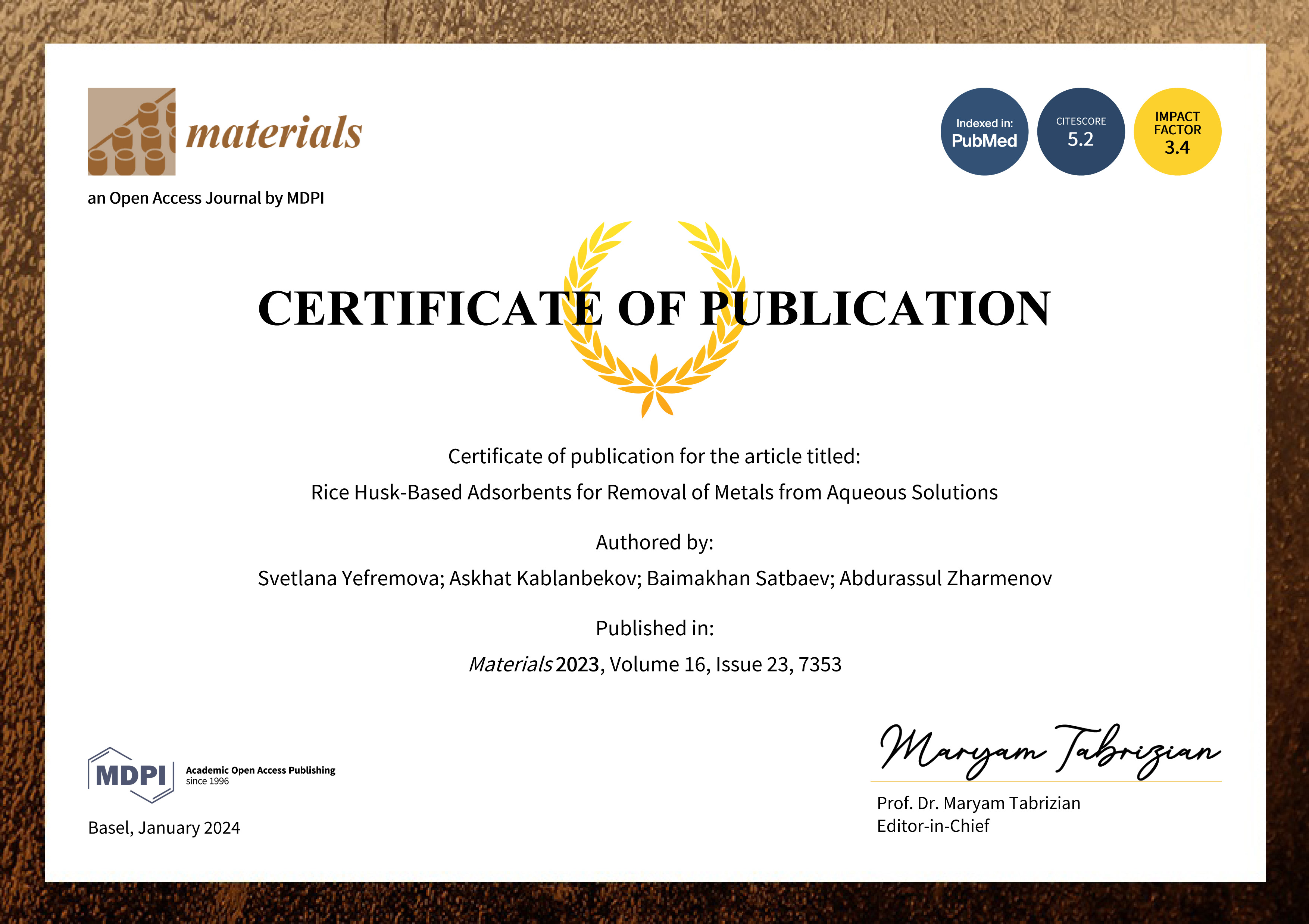 - S. Yefremova, A. Kablanbekov, B. Satbaev, A. Zharmenov. Rice Husk-Based Adsorbents for Removal of Metals from Aqueous Solutions / Materials. – 2023. – 16(23). – 7353. DOI: 10.3390/ma16237353