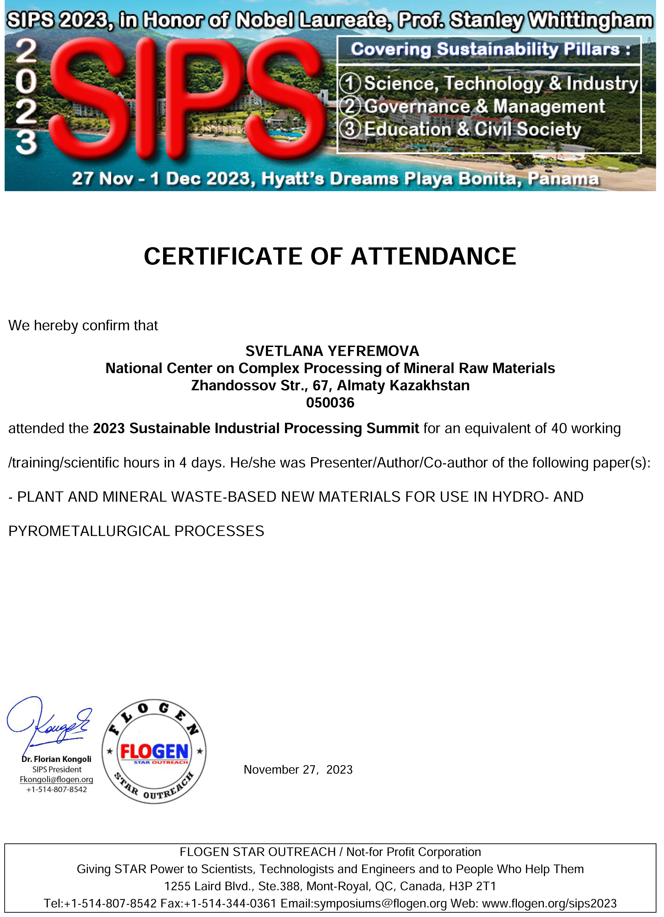 - SIPS2023 аясында өткен 9th Intl. Symp. on Sustainable Materials Recycling Processes & Products конференциясында «Plant and mineral waste-based new materials for use in hydro- and pyrometallurgical processes» атты ауызша баяндама ұсынылды.