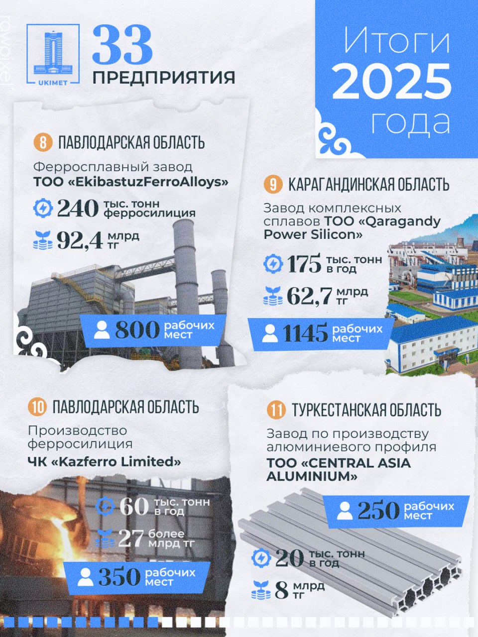 - ТОО «Qaragandy Power Silicon» (Карагандинский завод комплексных сплавов) (черная металлургия, Карагандинская область): инвестиции — более 62,7 млрд тенге, создано 1 145 рабочих мест, выпуск ферросилиция — 175 тыс. тонн в год с перспективой увеличения мощности до 600 тыс. тонн в год.
