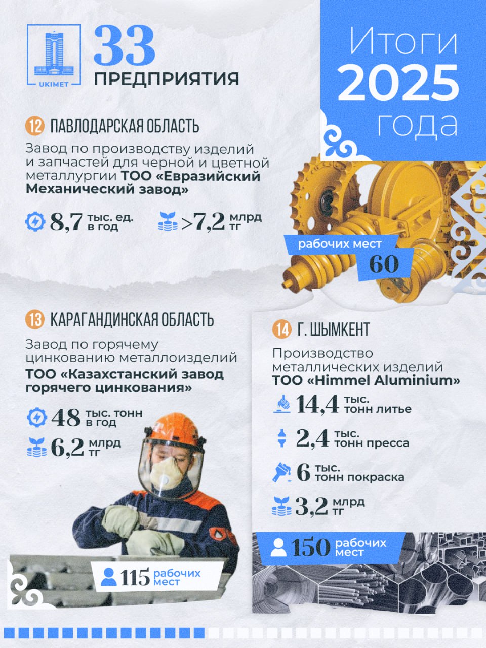 - ТОО «Himmel Aluminium» (черная металлургия, г. Шымкент): инвестиции — 3, 2 млрд тенге, создано 150 рабочих мест, выпуск металлических изделий: литье — 14 400 тонн, пресс — 2 400 тонн, покраска — 6 000 тонн.