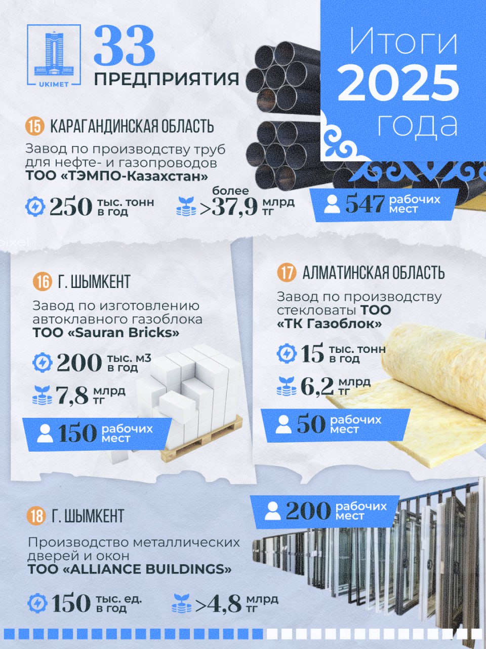- ТОО «ТК Газоблок» (производство стройматериалов, Алматинская область): инвестиции — 6,2 млрд тенге, создано 50 рабочих мест, выпуск минеральных утеплителей — 15 000 тонн металлоконструкций в год.