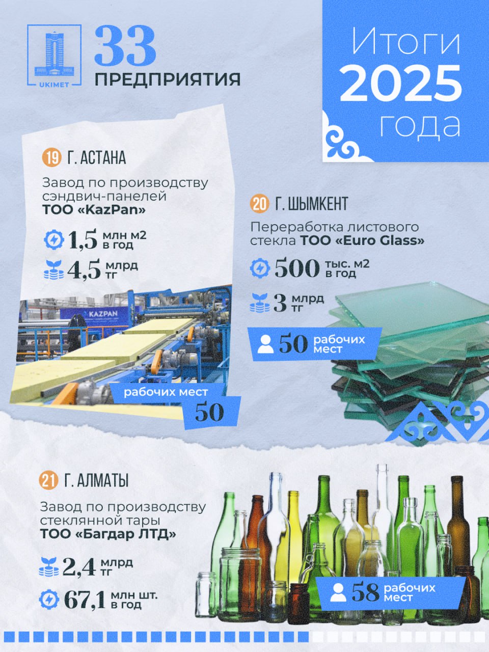 - ТОО «Багдар ЛТД» (производство стройматериалов, г. Алматы): инвестиции — 2,4 млрд тенге, создано 58 рабочих мест, производство стеклотары — 67,1 млн штук в год.