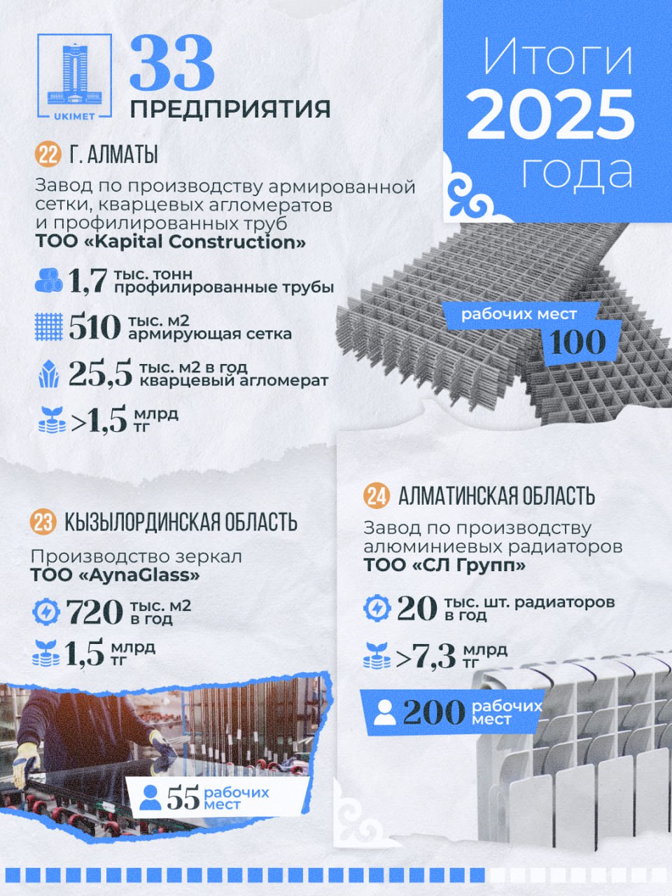 - ТОО «AynaGlass» (производство стройматериалов, Кызылординская область): инвестиции — 1,5 млрд тенге, создано 55 рабочих мест, производство зеркал — 720 тыс. м2 в год.