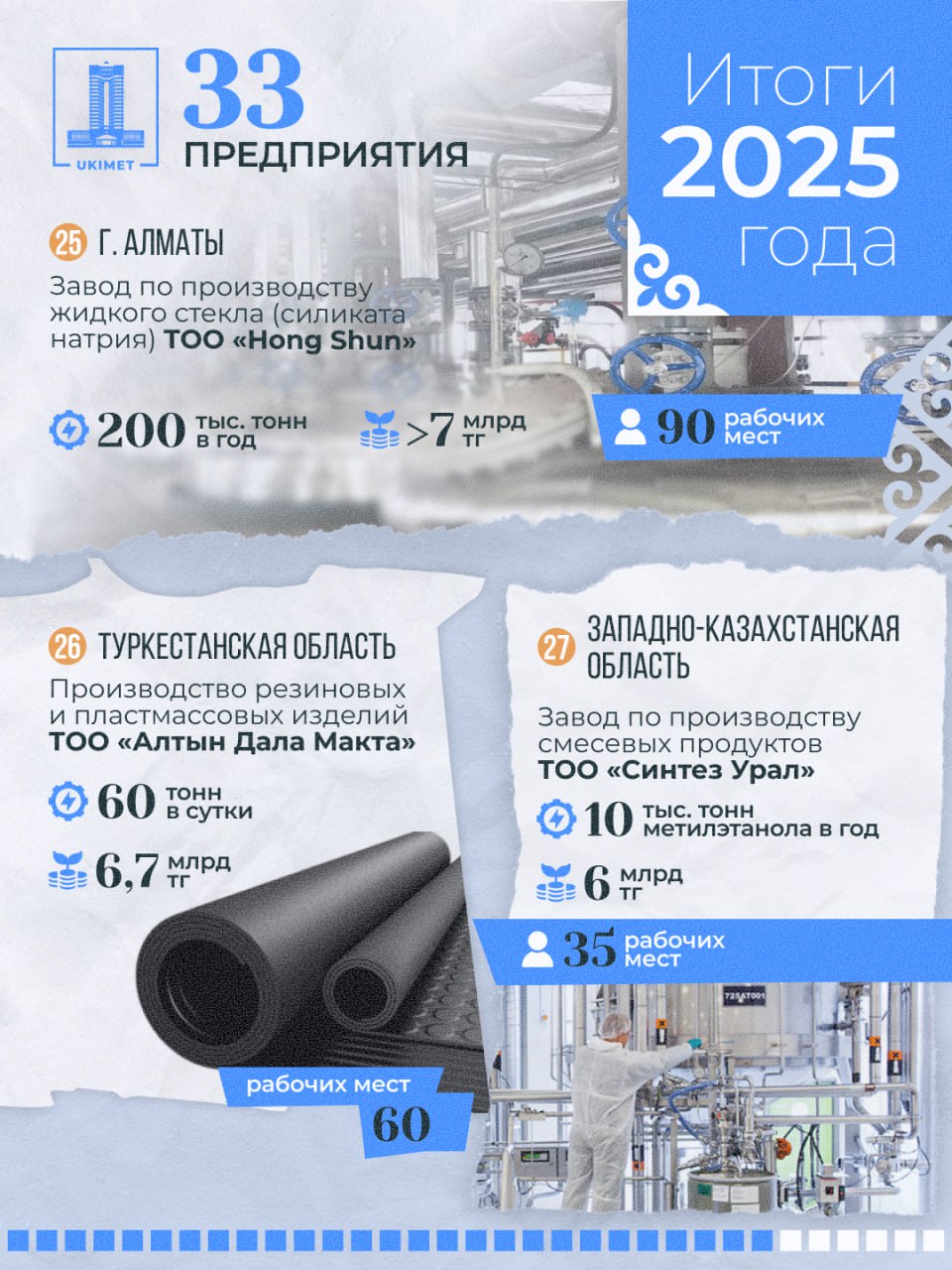 - ТОО «Синтез Урал» (химическая промышленность, Западно-Казахстанская область): инвестиции — 6 млрд тенге, создано 35 рабочих мест, производство метилэтанола — 10 000 тонн в год.