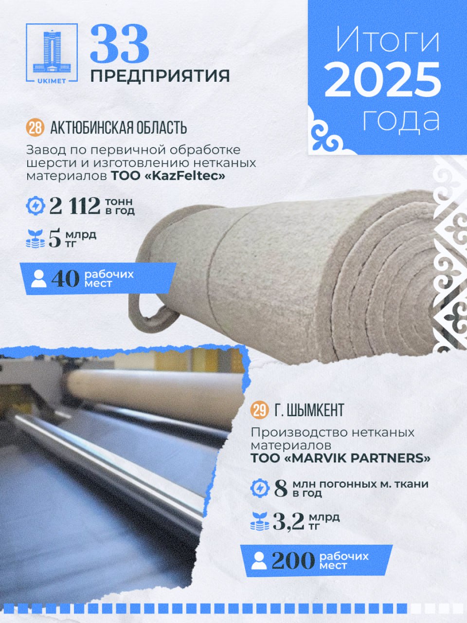 - ТОО «MARVIK PARTNERS» (легкая промышленность, г. Шымкент): инвестиции — 3,2 млрд тенге, создано 200 рабочих мест, производство нетканых материалов — 8 млн погонных метров ткани в год.