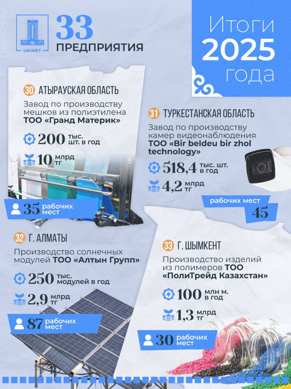- ТОО «Алтын Дала Макта» (производство резиновых и пластмассовых изделий, Туркестанская область): инвестиции — 6,7 млрд тенге, создано 60 рабочих мест, производство ПВХ труб — 60 тонн в сутки.