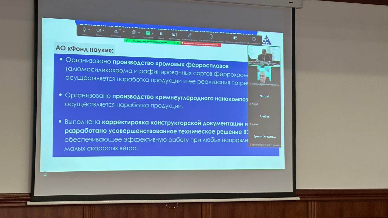 ҚР МШКҚӨ ҰО Бас директоры Асқар Нұрғалиев кәсіпорынның Ғылыми кеңесі отырысында жасаған баяндамасында мемлекеттік тапсырыс бойынша 30 жоба орындалғанын айтты және бағдарламаның негізгі нәтижелеріне тоқталды, және де аталған жұмыстардың жаңашылдығы мен бірегейлігі 22 өнертабыстар және пайдалы модельдерге берілген патенттермен және 7 авторлық құқық объектісімен расталғанын, өнертабысқа қатысты ондаған өтінім тиісті органда қаралу үстінде екендігін атап өтті. Ғылыми және (немесе) ғылыми-техникалық қызмет нәтижелерін коммерцияландыру жобаларын іске асыру нәтижесінде хромды ферроқорытпалар өндірісі іске қосылып, кремний-көміртекті нанокомпозит өндірісі ұйымдастырылды. Жел электр станциясын дайындау жөніндегі жоба да табысты орындалуда.