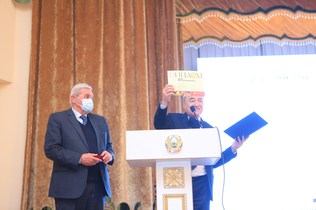 На внеочередном Ученом совете университета Генеральный директор РГП «Национальный центр по комплексной переработке минерального сырья РК», доктор технических наук, профессор, дважды лауреат Государственной премии РК, академик Абдурасул Жарменов вручил ректору ЮКУ им. М. Ауэзова Дарие Кожамжаровой «Диплом организации научного открытия» Российской Академии естественных наук и соавтору данного открытия, заведующему кафедрой «Металлургии», д.т.н., профессору Виктору Михайловичу Шевко – золотую медаль имени Петра Капицы и «Диплом автора открытия».