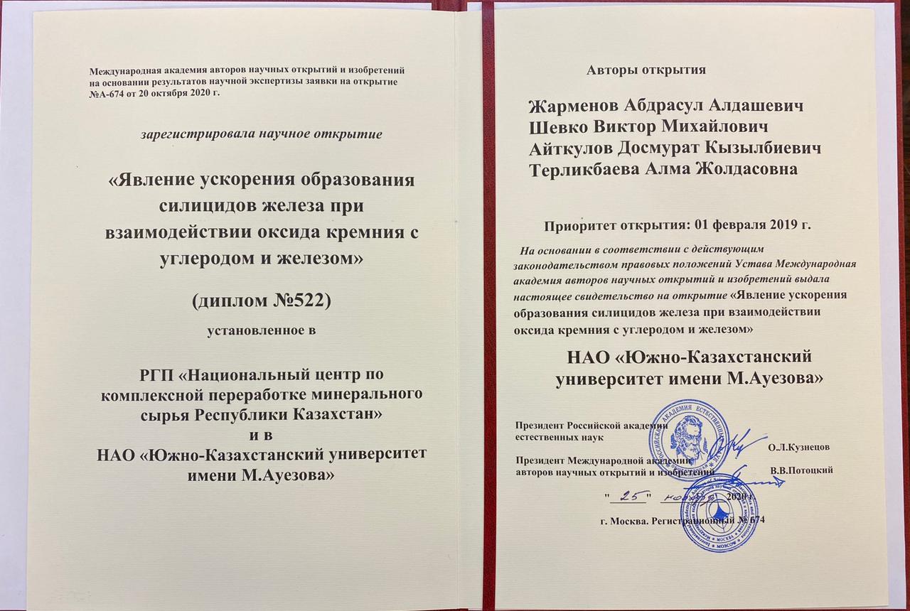 Исследовательская работа, представленная Национальным центром по комплексной переработке минерального сырья РК и Южно-Казахстанским университетом имени М. Ауэзова, признана научным открытием.