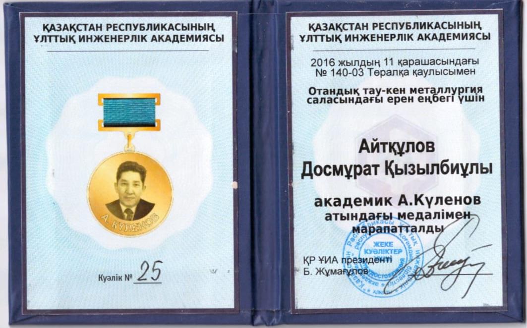 Айтқұлов Д.К. – металлургия және химиялық технология саласындағы танымал ғалым және жоғары мектептің педагог - ұйымдастырушысы. Кафедра инженерінен бастап университет ректорына және Қазақстан Республикасы Білім және ғылым министрлігінің департамент басшысына дейін ұйымдастырушылық, ғылыми, педагогикалық және кәсіби қызметтің барлық кезеңдерінен өтті. 40 жылдық жұмыс кезеңінде елімізде қоғамның, жоғары білім мен ғылымның дамуына елеулі үлес қосты.